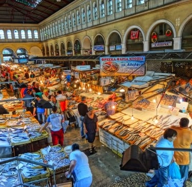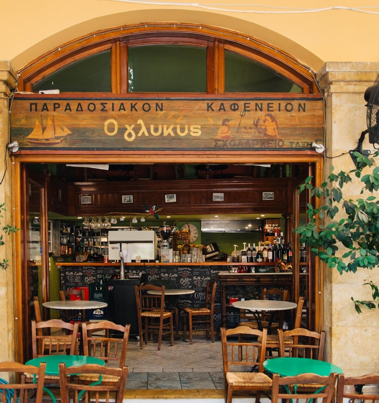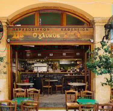 A tiny café tucked into a side street. The clink of cups, the smell of strong Greek coffee, and the slow rhythm of locals starting their day. No rush—just ritual.