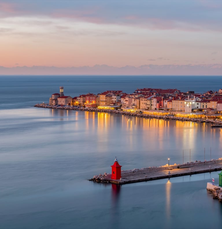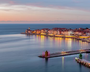 In Piran, the Adriatic feels softer at sunrise. The stone streets are empty except for locals heading toward the harbor, and the sound of water against the quay replaces the daytime hum of visitors. Café chairs are still stacked, shutters half-open, and the town feels briefly suspended between night and day.