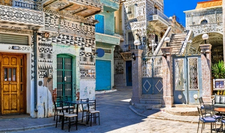 Every building in Pyrgi is etched with black-and-white geometric patterns known as xysta. Walking its narrow streets feels like stepping into a living canvas—where medieval architecture meets graphic design.