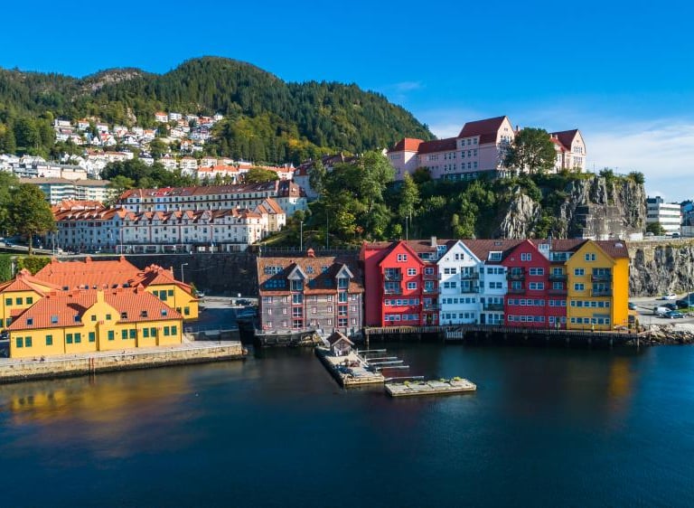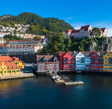 Gateway to fjords—colorful wooden wharf, mountains, and seafood markets in a less touristy Norwegian delight.